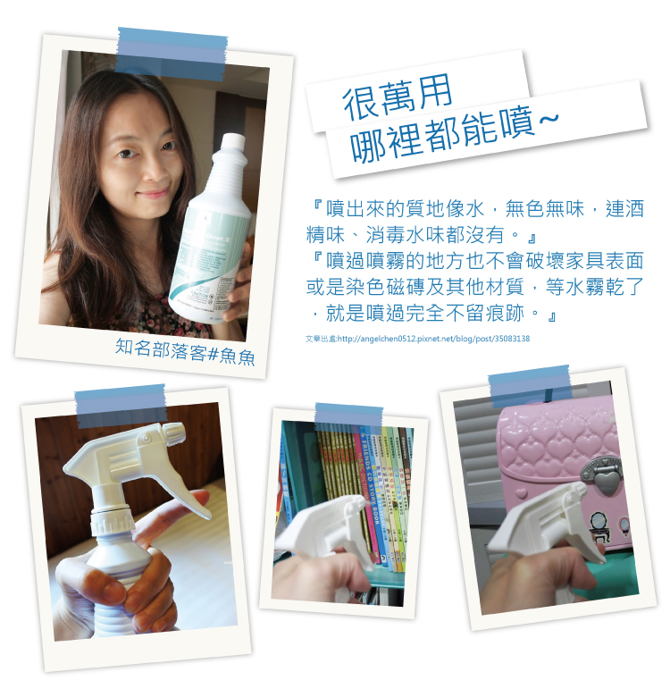 |                    使用方式  |                                              將髒汙清除後,直接噴灑於需要消毒的物品表面,例如:把手、玩具、桌面..等。噴灑後讓其自然風乾或用布擦拭乾淨即可。  |
