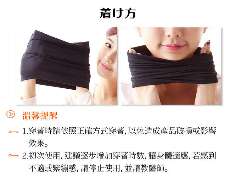 | 產品特色 | 日本名醫頸部養生法 ,多用途設計可當頸圍、頭帶、護腕,加入日本大和化工的溫泉磁石液化鍺元素,有助鎮定安寧、提高機能、消除疲勞。 |