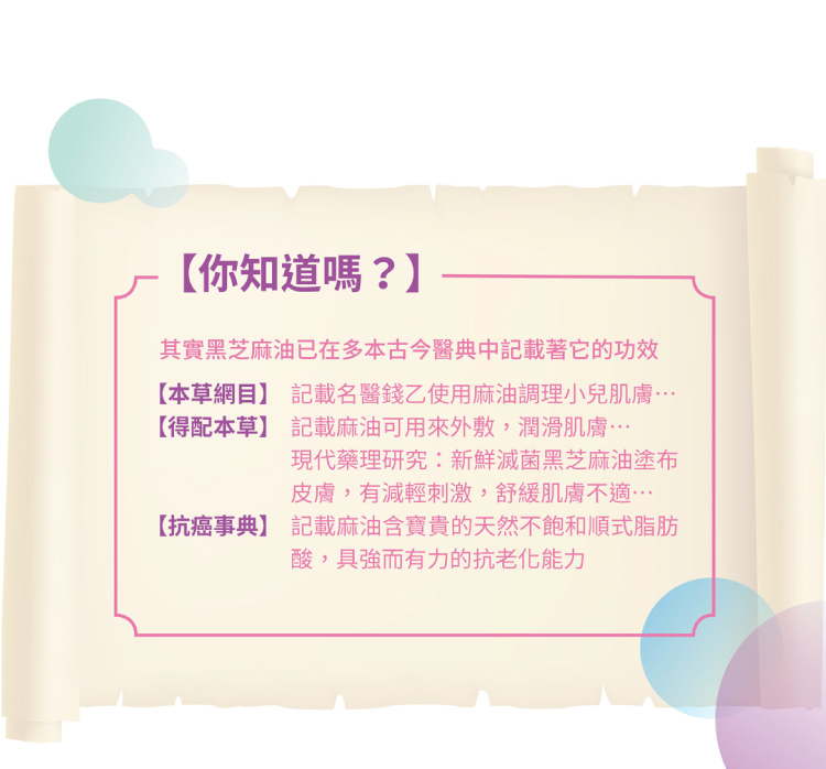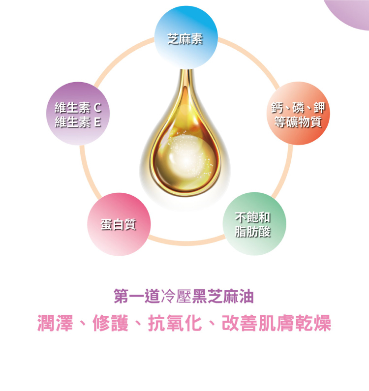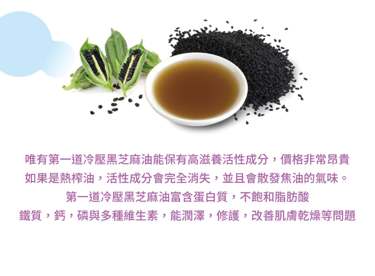 ✅採用第一道冷壓黑芝麻油與高品質原料,協助肌膚扺抗外來的侵襲,提升肌膚防禦力