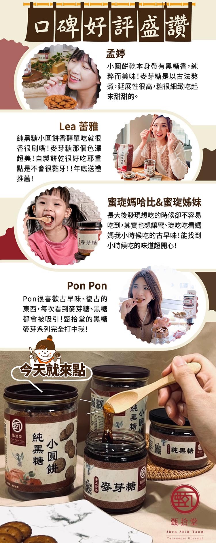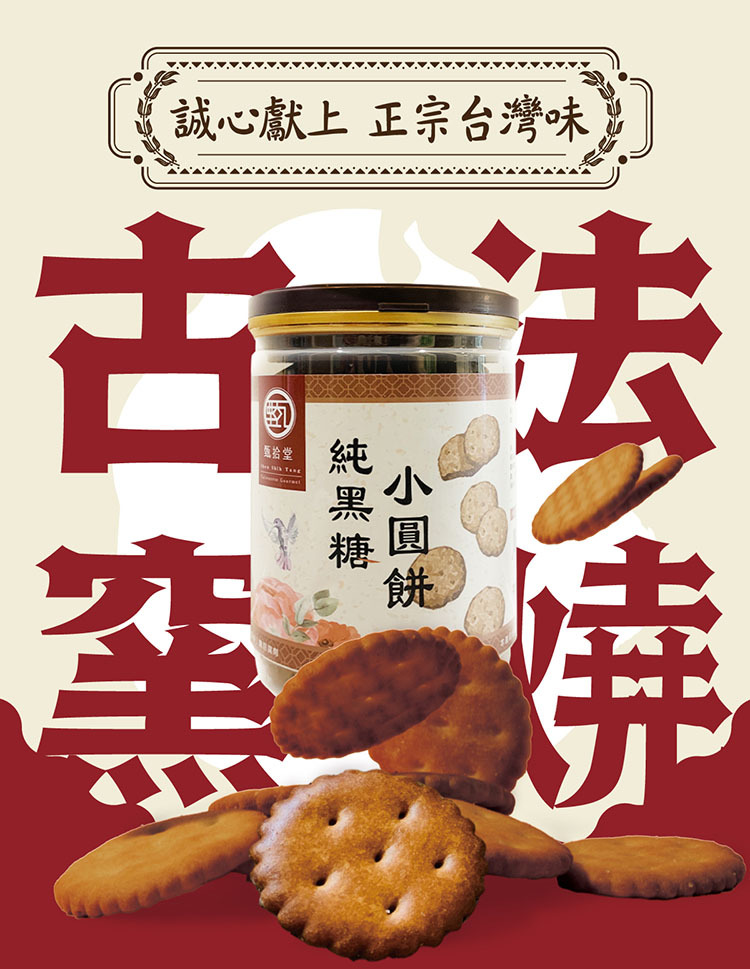 | 產品規格 | 品牌:甄拾堂 品名:純黑糖小圓餅 淨重:130g 成分:小麥粉、台灣純黑糖、棕櫚油、大豆油、鹽、碳酸氫胺、碳酸氫鈉 |