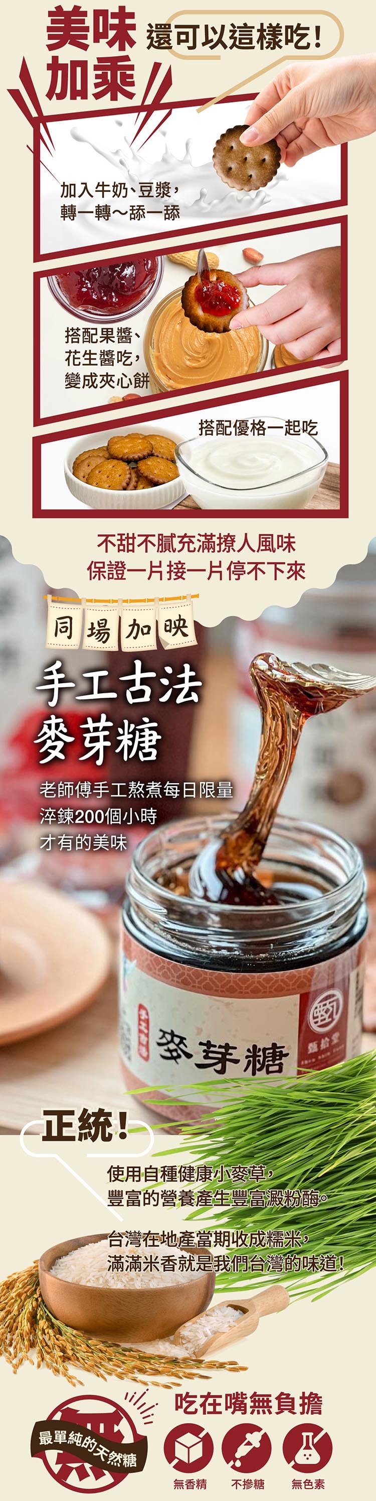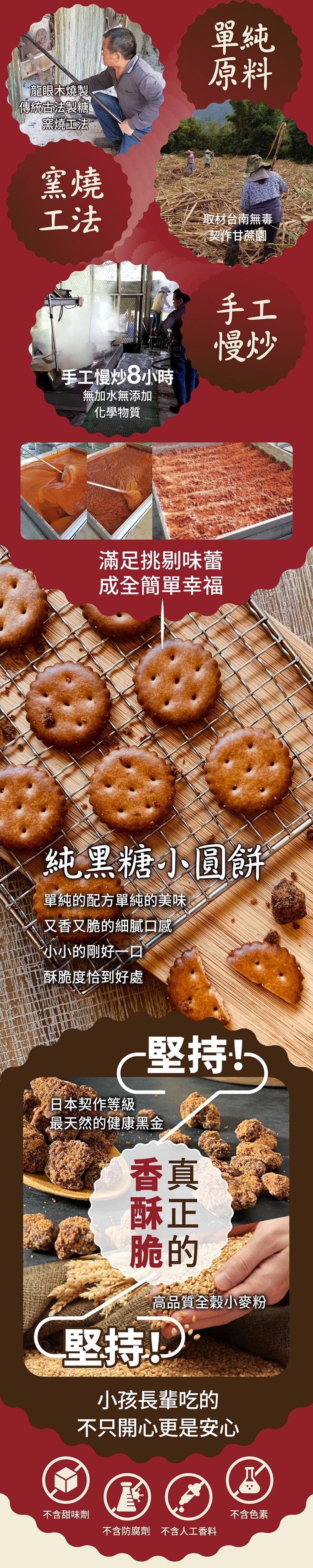 | 產品特色 | 【 唯一添加台灣在地頂級窯燒純黑糖】使用「黑糖粗製造法」經驗豐富的老師傅才懂的古法!能保留最多原始的營養素及純黑糖豐富濃厚焦糖香味!單純的配方吃得出單純的美味,不含甜味劑、人工香料色素、防腐劑,小小的剛好一口,酥脆度恰到好處,配牛奶、配豆漿、自夾麥芽糖,不甜不膩卻充滿撩人風味,一片接一片停不下來,令人心滿意足~ |