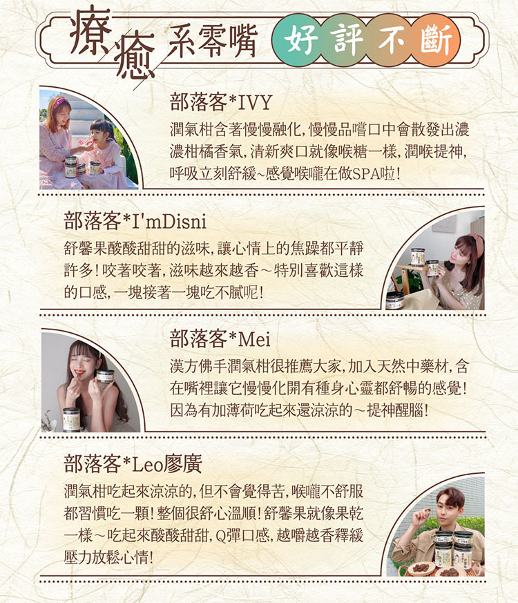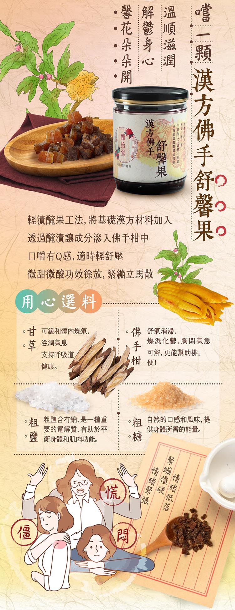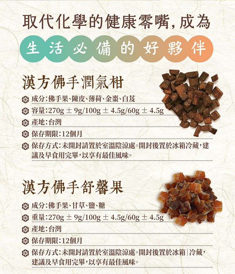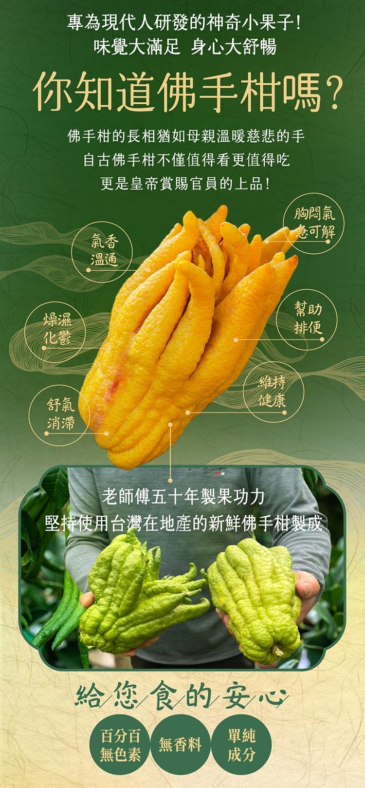 | 產品特色 | 50年製果經驗的老師傅獨家配方!簡單的原料搭配黃金比例,帶出佛手果的甜、香跟微酸。細細咀嚼會嘗到漢方材料的深蘊滋味,豐富纖維同時會協助身體更加平衡清爽。 |