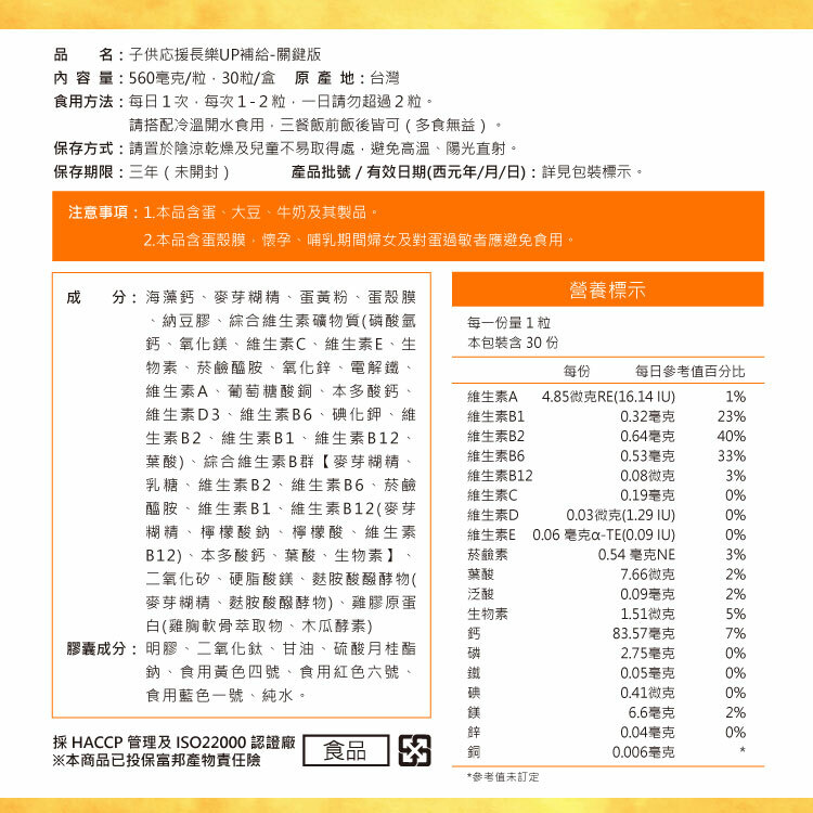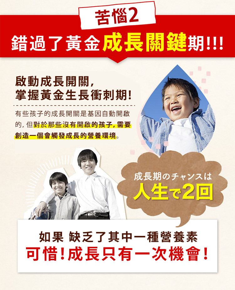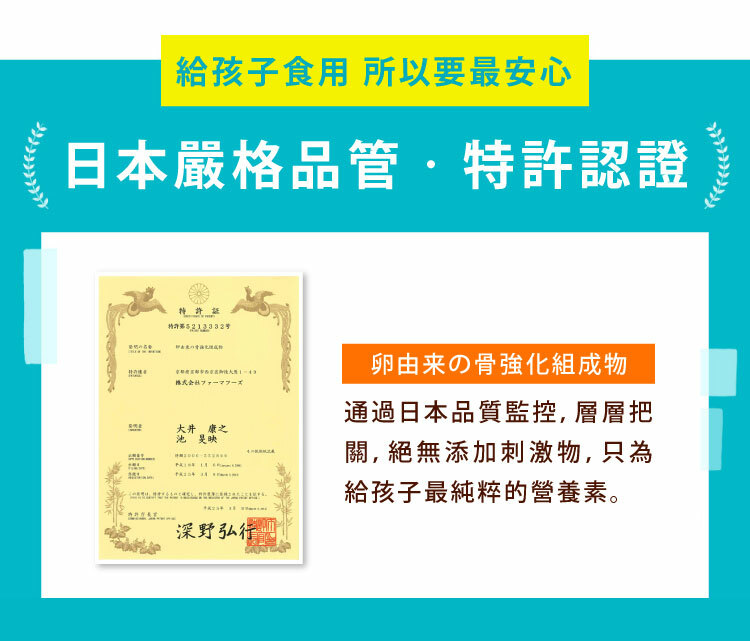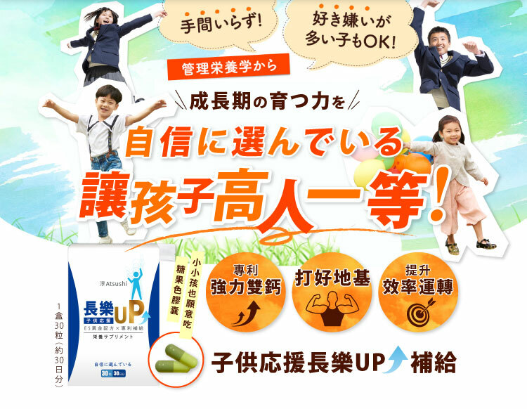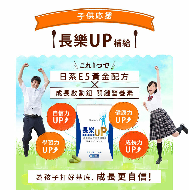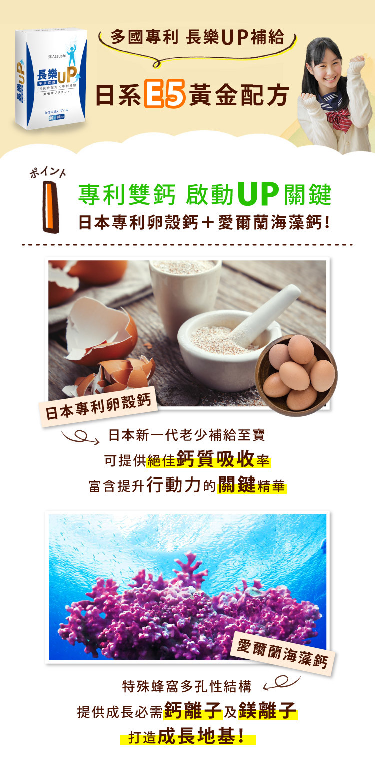 | 產品特色 | 日歐專利雙鈣【日本專利卵殼鈣X愛爾蘭海藻鈣】,打造成長地基!成長關鍵補給交給【長樂UP】!日系E5黃金配方,高効成長更給力,孩子贏在起跑點,成長一等應援啦啦隊! |
