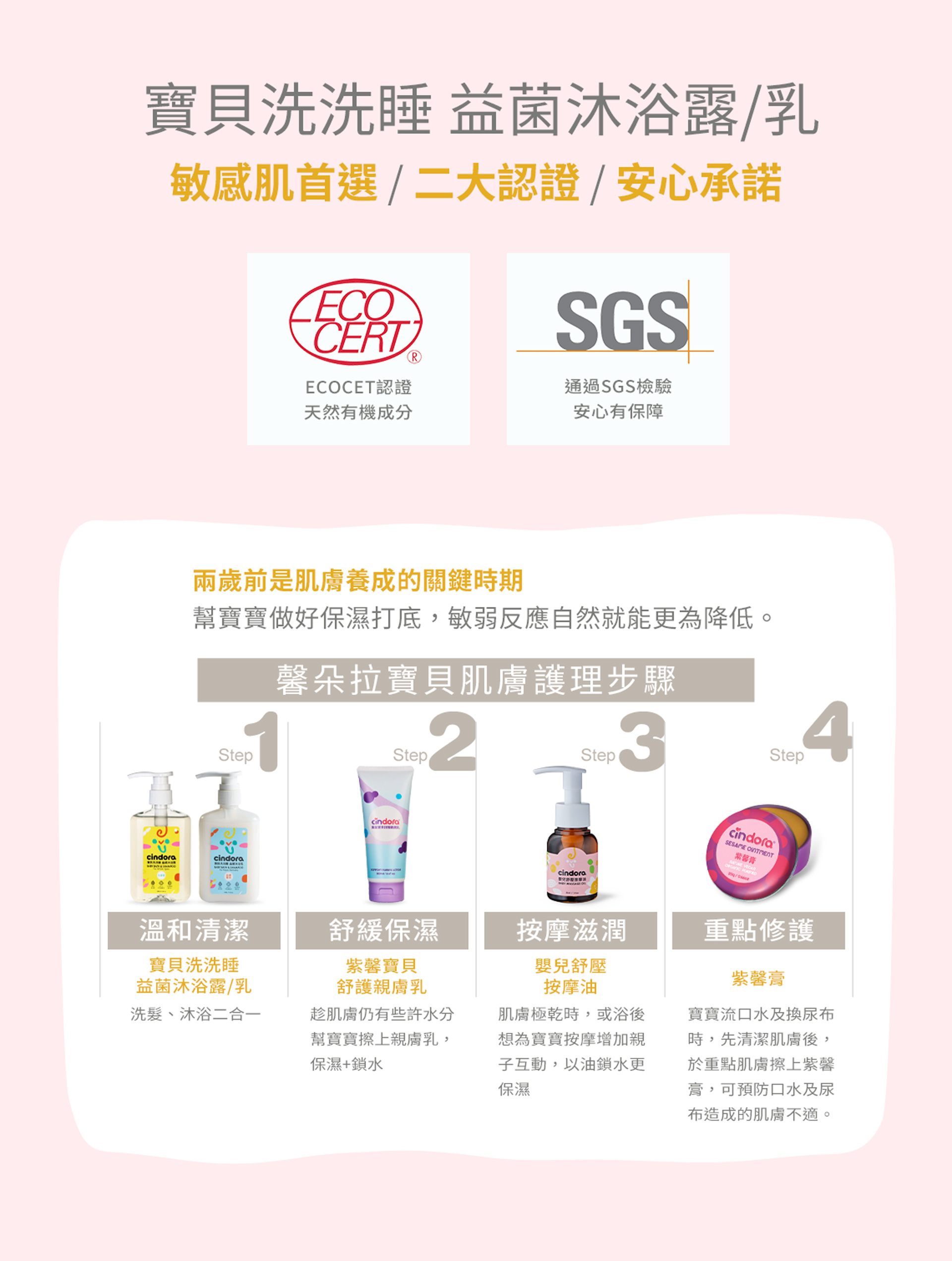 | 產品規格 | 品牌:馨朵拉 CINDORA 品名:寶貝洗洗睡益菌沐浴露 容量:340ml |