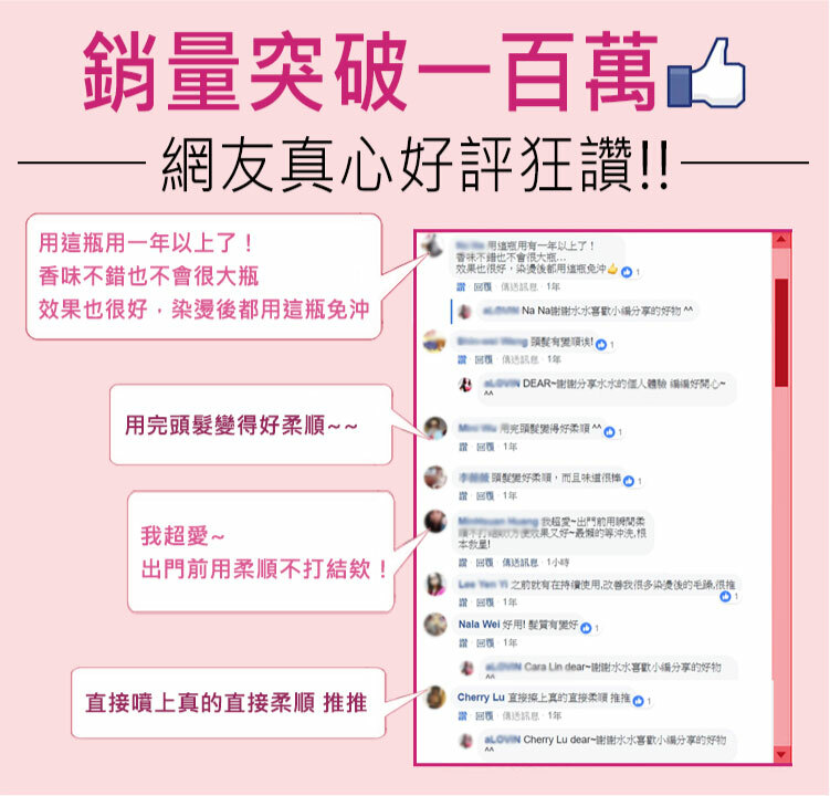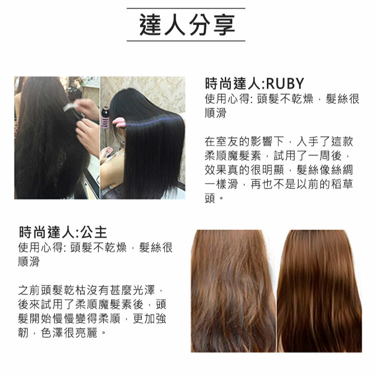 | 使用方式 | 均勻塗抹於濕潤的頭髮上,乾髮亦可使用,均勻塗抹於髮尾,再以吹風機將頭髮吹乾,可同時搭配圓梳將頭髮梳順。 |
