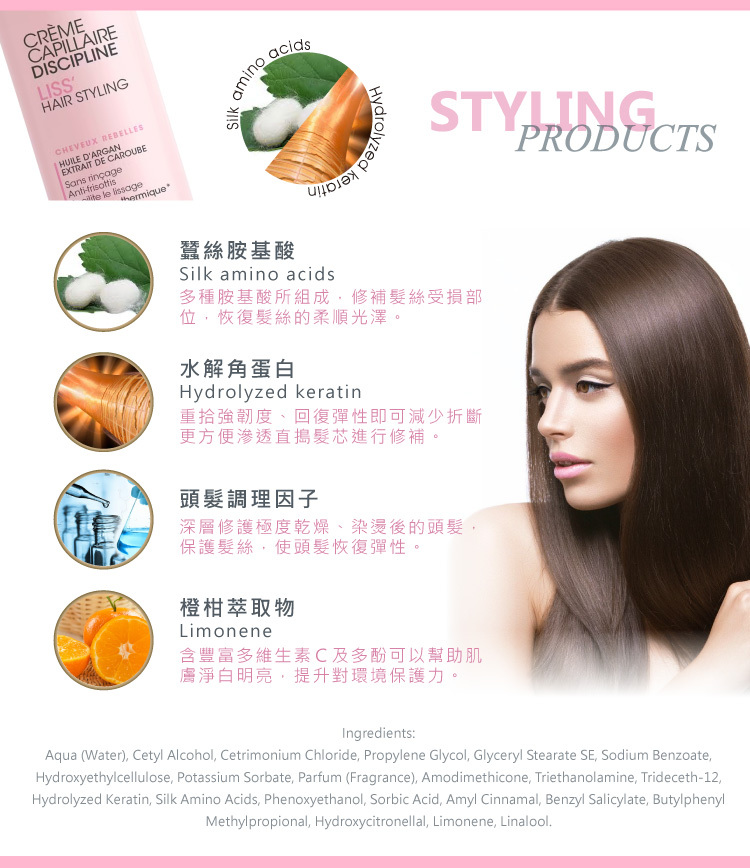 | 產品特色 | 水解角蛋白、蠶絲胺基酸雙明星髮蛋白營養,髮絲豐盈彈力帶來柔軟亮澤的秀髮。維持光滑有亮澤,避免秀髮毛躁糾結、分叉,角蛋白和蠶絲萃取,立即補給髮絲需要的蛋白質,增加頭髮的強韌度,保護染色過後的髮色。能柔順髮絲同時保護秀髮,幫助頭髮維持光滑有亮澤的健康狀態,保有如絲緞般的髮質! |